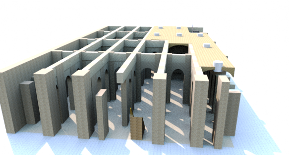 La struttura ha una pianta essenzialmente rettangolare di dimensioni di circa 40m x 24m; è stata costruita internamente con sei navate, coperta ognuna con una volta a botte con al centro un lucernario del diametro di circa 90cm circondato da muretti di protezione alti 35 cm e quasi totalmente distrutti.
